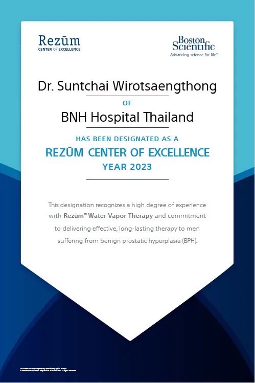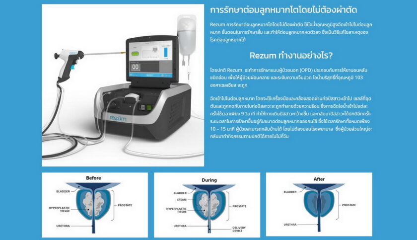 - Rezum คือวิธีการรักษาแบบไม่ต้องผ่าตัดโดยใช้ไอน้ำบริสุทธิ์ อุณหภูมิสูงประมาณ 103 องศาเซลเซียส วิธีคล้าย ๆ กับการผ่าตัดแบบดั้งเดิม โดยส่องกล้องเข้าไปแล้วใช้ไอน้ำผ่านเข็มเล็ก ๆ ฉีดเข้าไปในเนื้อต่อมลูกหมาก หลังฉีดเข้าไปในระยะยาวเซลล์จะถูกทำลายด้วยความร้อน ตายและลดขนาดลง ทำให้ทางเดินปัสสาวะเปิดกว้างขึ้นคนไข้สามารถใช้ชีวิตเป็นปกติ หลังผ่าตัดจะไม่มีอาการข้างเคียง และไม่ต้องรับประทานยาหลังผ่าตัดสามารถกลับบ้านได้ทันทีไม่ต้องนอนโรงพยาบาล ซึ่งเหมาะกับผู้ป่วยที่มีข้อจำกัดเรื่องการผ่าตัด