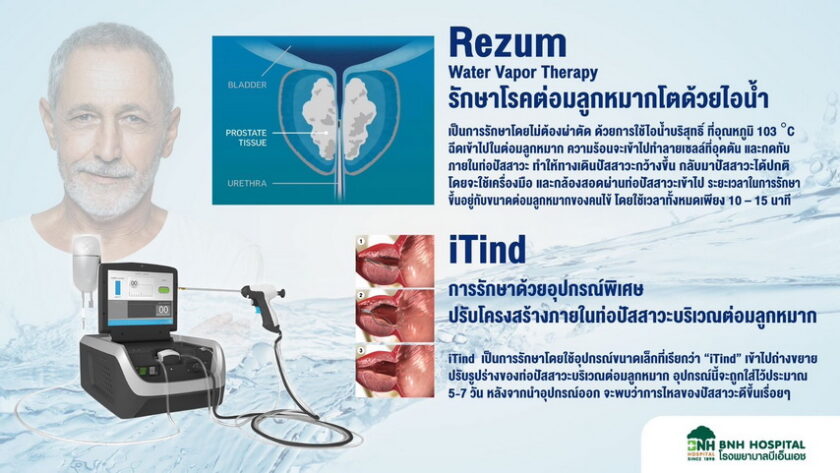 นายแพทย์สรรชัย วิโรจน์แสงทอง แพทย์ผู้ชำนาญการด้านระบบทางเดินปัสสาวะ โรงพยาบาลบีเอ็นเอช และยังเป็นแพทย์คนแรกของประเทศไทยที่สามารถรักษาต่อมลูกหมากโตได้ทั้ง 2 เทคนิค iTind และ Rezum กล่าวถึงวิธีการรักษาโรคต่อมลูกหมากโตนี้ว่า “คือโรคที่ต่อมลูกหมากโตขึ้น แล้วมีการบีบรัดทางเดินปัสสาวะทำให้ผู้ป่วยมีอาการ ปัสสาวะไม่พุ่ง ปัสสาวะไม่สุด ปวดปัสสาวะบ่อย คุณภาพการนอนหลับไม่ดี เพราะต้องลุกขึ้นมาปัสสาวะกลางดึกบ่อย อาการเหล่านี้ล้วนเป็นสัญญาณบ่งชี้ว่าคุณมีแนวโน้มที่จะเป็นโรคต่อมลูกหมากโตได้ คนที่เป็นโรคนี้ส่วนใหญ่จะเกิดขึ้นกับผู้ชายวัย 50 ปีขึ้นไป และจะพบมากถึง 90% ที่มีอายุ 60 – 90 ปี ในสมัยก่อนจะใช้การรักษา 2 วิธี คือ แบบทานยา ที่ผู้ป่วยต้องทานยาตลอดเพื่อใช้รักษาตามอาการที่เป็นอยู่ และ แบบผ่าตัด คือการส่องกล้องเข้าไปคว้านต่อมลูกหมาก ซึ่งทั้งสองแบบนี้จะมีผลข้างเคียงตามมาที่แตกต่างกัน อย่างการผ่าตัดอาจจะมีผลต่อการหลั่งน้ำอสุจิของคุณผู้ชายและทำให้สูญเสียสมรรถภาพทางเพศ จึงทำให้หลายคนไม่กล้าที่จะเข้ามารับการรักษา แต่ในปัจจุบันทางโรงพยาบาลได้นำนวัตกรรมที่ทันสมัยเข้ามาใช้รักษาเพื่อเป็นทางเลือกให้กับผู้ป่วยด้วย 2 เทคนิค ได้แก่