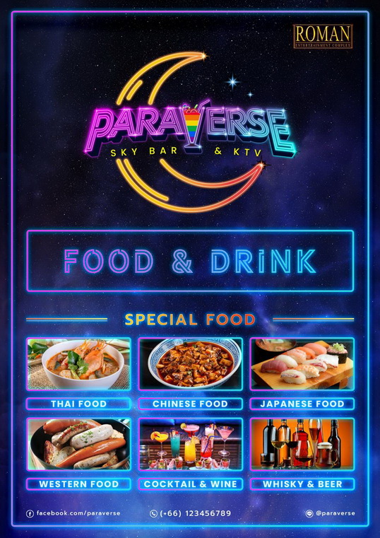 KARAOKE Paraverse (5 fl.) ห้องคาราโอเกะที่ตกแต่งหลากหลายความชื่นชอบ อาทิ ทาสแมว , ทรานฟอเมอร์ , นักแข่งรถ , คิตตี้ และ ROMAN VIP เหมาะสำหรับจัดกิจกรรมเลี้ยงสังสรรค์สำหรับองค์กร , ฉลองวันเกิด หรือพาคนพิเศษครอบครัวมาทานอาหาร และร้องเพลงแบบส่วนตัว