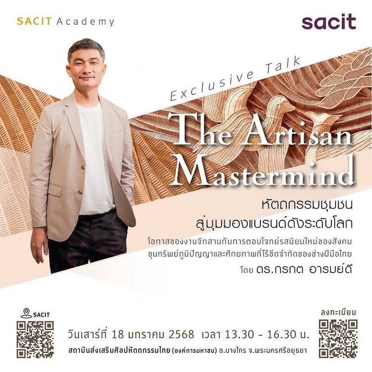 สถาบันส่งเสริมศิลปหัตถกรรมไทย (องค์การมหาชน) จัดกิจกรรม SACIT Academy เสวนาพิเศษการสร้างสรรค์งานศิลปหัตถกรรมสู่สายตาแบรนด์ระดับโลก เพื่อเจาะลึกเบื้องหลังความสำเร็จ ขุมทรัพย์ทางภูมิปัญญาและศักยภาพที่ไร้ขีดจำกัดของช่างฝีมือไทย โดย ผศ.ดร.อนุชา ทีรคานนท์ ผู้อำนวยการสถาบันส่งเสริมศิลปหัตถกรรมไทย และ ดร.กรกต อารมย์ดี นักออกแบบ และนักสร้างสรรค์แบรนด์ หนึ่งในทีมสร้างสรรค์คาเฟ่ ดิออร์ ภายใน Dior Gold House ในวันเสาร์ที่ 18 มกราคม 2568 เวลา 13.30 น. ณ อาคารนวัตศิลป์ สถาบันส่งเสริมศิลปหัตถกรรมไทย (องค์การมหาชน) ลงทะเบียนเข้าร่วมกิจกรรมได้ที่ https://shorturl.asia/riGjH