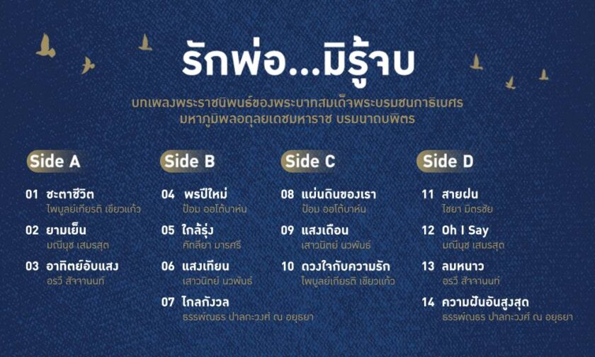 “รักพ่อ…มิรู้จบ” Vinyl 2LP / 45 RPM คือการรวมตัวครั้งสำคัญของ 8 ศิลปินไทย ที่ล้วนแล้วแต่มีเอกลักษณ์การขับร้องเฉพาะตัว ได้แก่ ปั่น ไพบูลย์เกียรติ เขียวแก้ว – มณีนุช เสมรสุต – กบ เสาวนิตย์ นวพันธ์ – ป้อม ออโต้บาห์น – อู๋ ธรรพ์ณธร ปาลกะวงศ์ ณ อยุธยา – อรวี สัจจานนท์ ร่วมด้วย ไชยา มิตรชัย และ คัทลียา มารศรี รวมหัวใจขับร้องบทเพลงพระราชนิพนธ์ ของพระบาทสมเด็จพระบรมชนกาธิเบศร มหาภูมิพลอดุลยเดชมหาราช บรมนาถบพิตร ผนวกกับฝีไม้ลายมือการเรียบเรียงเสียงประสานชั้นครูของอาจารย์วิรัช อยู่ถาวร “รักพ่อ…มิรู้จบ” จึงเป็นอัลบั้มที่จะทำให้ชาวไทยทุกคนได้ภูมิใจและสุขใจไปกับการฟังเพลงของพ่อ ผลงานที่อยากให้คนไทยได้สะสม และมอบเป็นของขวัญในทุกโอกาส จากค่าย “เมโทรแผ่นเสียง-เทป (1981) จำกัด”