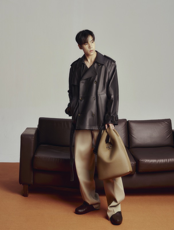เจษ เผยความสง่าในลุคแจ๊คเก็ตหนังสีน้ำตาลเข้มที่มีดีเทลอันประณีต แมตช์กับกางเกงสีเบจ และรองเท้าโลฟเฟอร์หนังสีน้ำตาลรุ่นคลาสสิก