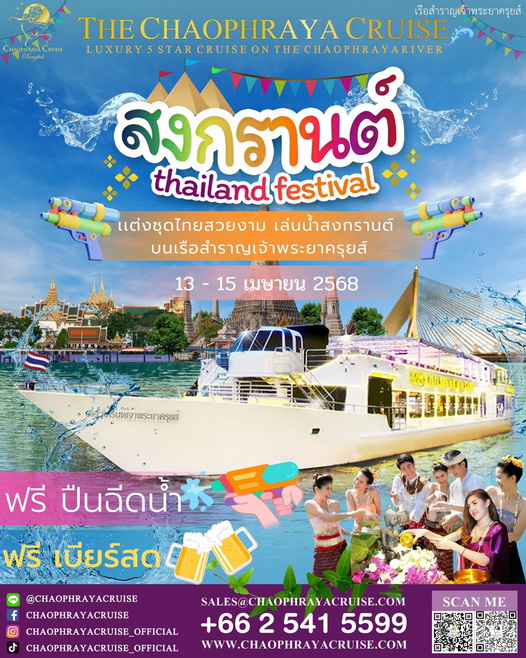 ต้อนรับสงกรานต์ 13 – 15 เมษายน 2568 กับกิจกรรมสุดพิเศษบนเรือสำราญสุดหรู “Chaophraya Cruise” ให้คุณดื่มด่ำบรรยากาศริมแม่น้ำเจ้าพระยา พร้อมความสนุกแบบจัดเต็ม ทั้งการเล่นน้ำสงกรานต์สุดมันส์ การแต่งชุดไทยสุดงดงาม และโปรโมชั่นสุดคุ้ม