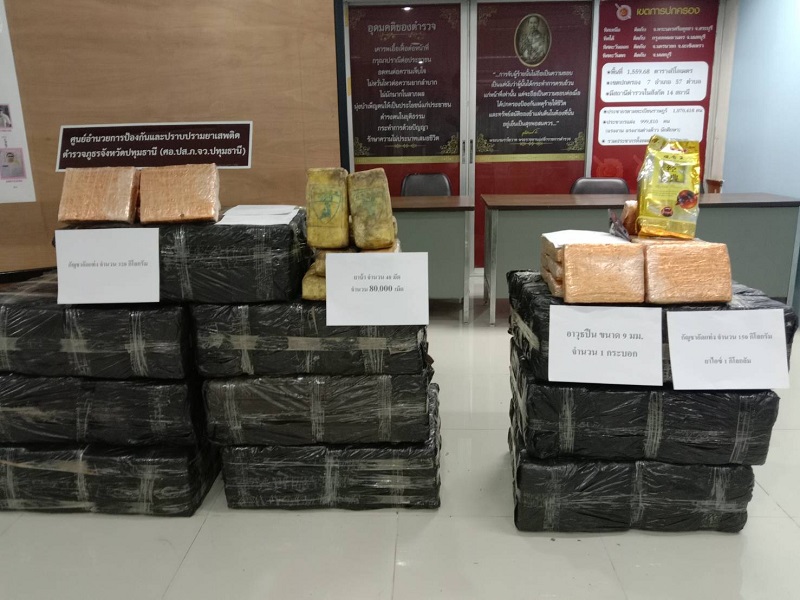 ต่อมาวันที่ 19 ก.พ. 64 เวลา 19.30 น. ภายใต้การอำนวยการของ พล.ต.ต.ชยุต มารยาทตร์ ผบก.ภ.จว.ปทุมธานี กับ พ.ต.อ.ธรรมนูญ เชาวะวนิชย์ รอง ผบก. และ พ.ต.อ.สมศักดิ์ นิเต็ม ผกก.สส.ภ.จว.ปทุมธานี นำโดย จนท.ตร.ศอ.ปส.ภ.จว.ปทุมธานี และ ศอ.ปส.ภ.1 ได้ร่วมกันทำการจับกุม 1.นาย ข.(นามสมมุติ) อายุ 24 ปี, 2.นาย ภ. (นามสมมุติ) อายุ 40 ปี, 3.นาย ว.(นามสมมุติ) อายุ 41 ปี พร้อมด้วยของกลาง 1.กัญชาแห้ง จำนวน 470 กก., 2.ยาบ้า จำนวน 80,000 เม็ด, 3.ยาไอซ์ จำนวน 1 กก., 4.อาวุธปืน ขนาด 9 มม., 5.รถยนต์ จำนวน 4 คัน