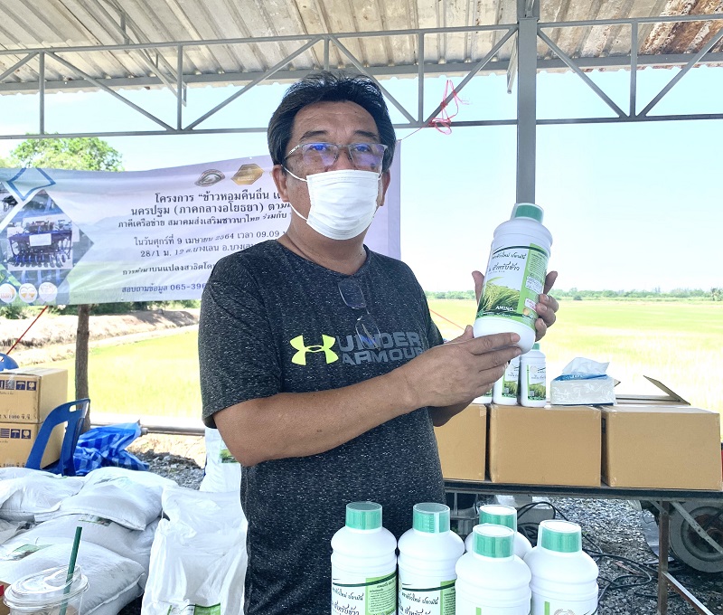 คุณวิชาญ ทองดอนโต เลขาธิการสมาคมส่งเสริมชาวนาไทย ในฐานะ ผู้จัดการแปลงนาสาธิต กล่าวว่า วันนี้ได้ช่วยคุณสมชาย แจ่มนิยม ในการควบคุมการพ่นวัสดุปรุงดินและพ่นกรดอะมิโน เพื่อเสริมคุณภาพของปุ๋ยให้มีประสิทธิภาพในการในการช่วยต้นข้าวแตกกอได้อย่างมีประสิทธิภาพ ซึ่งต้องรอดูการแตกกอของข้าวในอีกประมาณ 10-15 วัน จะเห็นภาพว่าต้นข้าวจะแข็งแรง ต้านทางโรค และแตกกอได้ผลประการใด ในอีกประมาณ 20 วันจะทำการใส่ปุ๋ย รวมถึงกรดอะมิโนอีกครั้ง โดยการทำแปลงนาสาธิตครั้งนี้จะทำการทดลองใส่ปุ๋ย 3 ครั้ง ซึ่งปรกติตามหลักวิชาการจะใส่ประมาณ 2 ครั้ง แต่เนื่องด้วยการปฏิบัติจริงนั้นควรใส่ 3 ครั้ง เพราะ 7-10 วันปุ๋ยและสารต่างๆก็จะหมดฤทธิ จึงจะทำการใส่ 3 ครั้งแต่ครั้งที่ 3 นั้นจะเป็นการโปรยเฉยๆ ไม่ต้องใช้เครื่องพ่น ตนเองคาดว่าภายใน 15 วัน ต้นข้าวในแปลงนาสาธิตจะเติบโตย่างแข็งแรงแตกกออย่างมีคุณภาพ