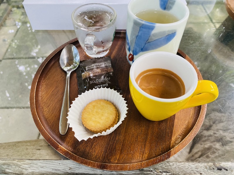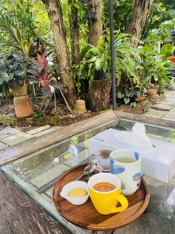ส่วนผมก็เช่นเคย ขอเป็นเอสเพรสโซ่ร้อน 1 ถ้วย ทางร้านจัดเป็นชุดมาเสิร์ฟเป็นถาดเล็ก ๆ ดูน่ารักมีเอสเพรสโซ่ร้อน มีขนมปังและน้ำชาร้อนแถมมาด้วย สั่งคู่กับมันฝรั่งทอดหรือเฟรนส์ฟรายส์ราคาจานละ 50 บาท เบ็ดเสร็จจ่ายเงินไป 85 บาท จัดว่าราคาไม่แพงเลยครับ ส่วนผู้ที่ชอบกาแฟเข้มข้นแบบเย็นๆ สั่งได้มอคค่าเย็นหรือจะปั่นก็มี นอกจากนี้ก็ยังมีเมนูอื่นๆ ให้เลือกอีกหลายหลายตามชอบของแต่ละท่านครับ ทุกท่านสามารถเลือกที่นั่งได้ในมุมมองของผู้มาเยือนตามชอบตามสไลต์ของแต่ละท่านครับ ชอบชิล ๆ สบาย ๆ ในสวนเหมือนบ้านตนเองที่มีโอโซนเยี่ยม มีชิงช้าให้นั่งเล่น หรือจะเลือกห้องแอร์เย็น หรือจะเลือกรับลมใต้ร่มไม้ร่มรื่นก็ได้เช่นกัน