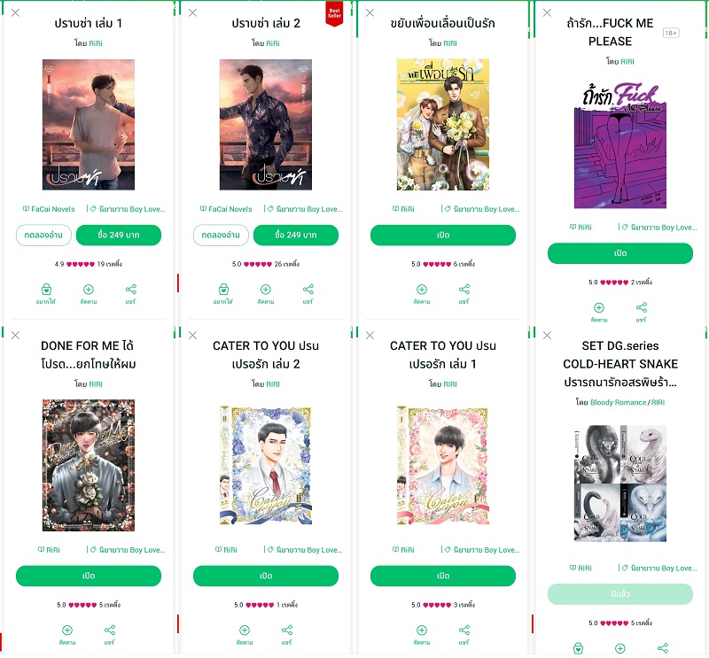 ส่วนของการวาดปกส่วนมากใช้นักวาดประจำ เพราะจะรู้สไตล์ของเขา กับเลือกนักวาดที่เข้ากับโทนเรื่องนิยายของเรา ไม่ค่อยเกี่ยงเรื่องราคาวาดเท่าไหร่ หากลายเส้นนักวาดเหมาะกับงานเราจริง ๆ ก็ทุ่มค่ะ ที่ถามว่าพระเอกนายเอกแบบที่นักอ่านชอบ ริริคิดว่าน่าจะเป็นแบบพระเอกแบด ๆ หน่อย แล้วก็นายเอกสายน้องอ้อน ๆ มั้งค่ะ ริริก็ชอบ 55555 ส่วนมากที่เห็นชอบ ๆ กันก็แนวนี้ ไม่ค่อยแน่ใจเท่าไหร่