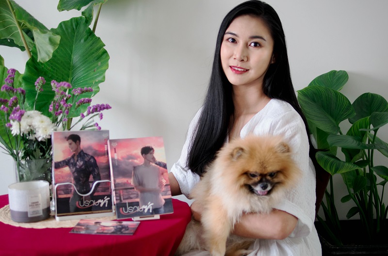 ส่วนแรงบันดาลใจในการเขียนนิยายก็คงเป็นจินตนาการหลังจากที่ได้เสพอะไรสักอย่างอย่างเช่น การอ่าน การฟังเพลง ดูหนัง หรือการดูรูปภาพต่าง ๆ เมื่อรับรู้ความรู้สึกและมีอารมณ์ร่วมกันสิ่ง ๆ นั้น ก็จะรู้สึกอยากเขียนอะไรที่ให้อารมณ์เหมือนกับที่เรารู้สึก ก่อนหน้านั้นเราเคยเขียนนิยายชายหญิงตอนที่อยู่มอห้า แล้วพอเข้ามหาลัยเพื่อนก็แนะนำให้อ่านนิยายวายในเล้าเป็ด เราอยากเขียนนิยายอยู่แล้ว และรู้สึกอยากจะลองเขียนดูว่าเราจะทำได้ไหม จากนั้นก็ลงมือเขียนนิยายวายเรื่องแรกคือ ‘Pretty Boy เจ้าชายตัวน้อยของผม’ คู่พี่ทราฟกับน้องเค้กค่ะ นิยายที่เขียนออกมาทั้งหมด 12 เรื่องได้ค่ะ รวมทั้งเรื่องสั้นและเรื่องยาว และเป็นนิยายวายทั้งหมด
