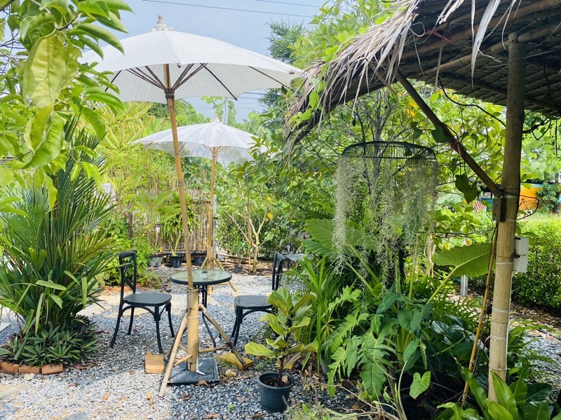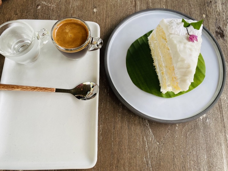 วันนั้นผมก็สั่งเอสเพรสโซ่ร้อน 1 ชอตตามปกติของผม กาแฟรสเข้มกับคนเท่ๆ ก็เพิ่มรสชาติชีวิตดีจริงๆ ครับ เข้ม เท่ จริงใจ คือผมล่ะครับ (ฮ่าๆ ) ช่างถูกคอกาแฟอยู่ไม่น้อย กาแฟร้านนี้เป็นกาแฟอาราบิก้าจากบนดอยภาคเหนือ จังหวัดเชียงราย แหล่งปลูกกาแฟขึ้นชื่อ สั่งขนมเค้กอร่อย ๆ ซึ่งทางร้านก็แนะนำเค้กมะพร้าวอ่อนของที่นี่ทำเอง รสไม่หวานมากเกินไป นั่งจิบกาแฟ 1 แก้วกับเค้กมะพร้าวอ่อน 1 ชิ้นใต้ซุ้มร่มไม้เงียบๆ มุมสบายๆ ครับ เสร็จก็ผมเก็บภาพสวยๆ ของร้านมาให้ท่านผู้อ่านดูบรรยากาศของร้านบ้านสีขาว คาเฟ่ในสวนเล็กๆ จนพอใจแล้วค่อยกลับ (จะมาใหม่)