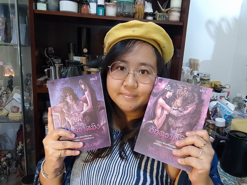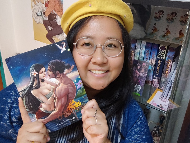 “ปัจจุบันเป็นพนักงานบริษัทค่ะ เขียนนิยายเป็นอาชีพเสริม นิยายเรื่องแรกที่เขียนจบคือ “มันตราสมิง” ค่ะ เป็นนิยายโรมานซ์แฟนตาซีแบบไทย ๆ เพราะพระเอกเป็นเสือค่ะ กระแสตอบรับสำหรับตัวเองคิดว่าดีมาก ๆ เพราะตอนหนึ่ง ๆ นั่งตอบคอมเมนต์จนแทบไม่ได้หลับไม่ได้นอน(ฮา) แต่มันเป็นช่วงเวลาที่มีความสุขมาก ๆ เลยค่ะ เพราะคุณ ๆ นักอ่านแวะเวียนมาพูดคุยแลกเปลี่ยนความคิดเห็นกันในเรื่องต่าง ๆ เยอะมากค่ะ เราได้แลกเปลี่ยนความเชื่อของแต่ละภาค และความรู้สึกที่มีต่อตัวละครอื่น ๆ ที่ไม่ใช่แค่พระเอกนางเอกด้วยค่ะ แล้วก็…มันตราสมิงเองก็เป็นเรื่องแรกที่มียอดวิวในเว็บเกิน 6 แสน(ในธัญวลัย) แล้วก็อีกเว็บน่าจะประมาณ 2 แสนกว่าค่ะ จริง ๆ อยากให้ทุก ๆ คนได้ลองอ่านมันตราสมิงดูเพราะเป็นเรื่องแรกที่เขียนจบและเป็นต้นกำเนิดของจักรวาลเล่มอื่น ๆ ค่ะ