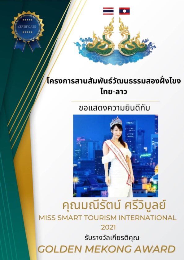 โอ๊ตตี้ มณีรัตน์ ศรีวิบูลย์ Miss Smart Tourism International 2021 พิธีกร นักแสดง เข้าร่วม โครงการสานสัมพันธ์วัฒนธรรมสองฝั่งโขง ไทย-ลาว ครั้งที่ 5 และได้รับมอบโล่ประกาศเกียรติคุณ รางวัลแม่โขงทองคำ (Golden Mekong Award) ซึ่งได้ถูกจัดขึ้น ณ รร.ศิลปะแห่งชาติ นครหลวงเวียงจันทน์ สปป.ลาวฃ
