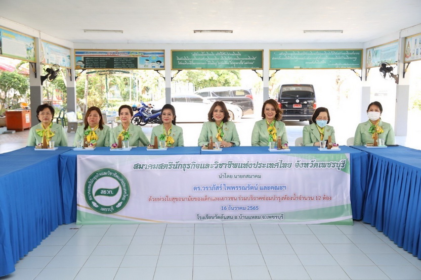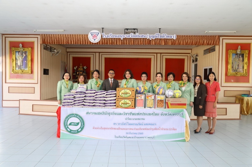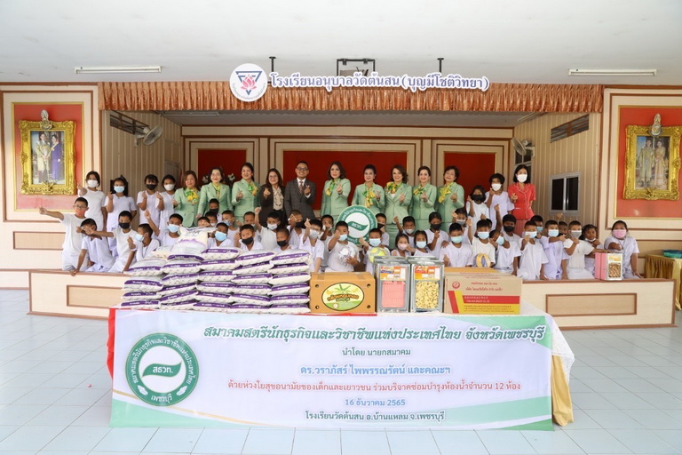 เมื่อวันที่ 16 ธันวาคม 2565 ดร.วราภัสร์ ไพพรรณรัตน์ นายกสมาคมสตรีนักธุรกิจและวิชาชีพแห่งประเทศไทย เพชรบุรี และคณะกรรมการสมาคมฯ ได้เดินทางไปทำกิจกรรมเพื่อการกุศลในพื้นที่จังหวัดเพชรบุรี ด้วยการบริจาคอุปกรณ์กีฬา เครื่องอุปโภคบรโภค และเงินสด ให้กับโรงเรียนบ้านต้นสน อำเภอบ้านแหลม จังหวัดเพชรบุรี โดยมีผู้อำนวยการโรงเรียน คณะครู และนักเรียน ให้การต้อนรับ