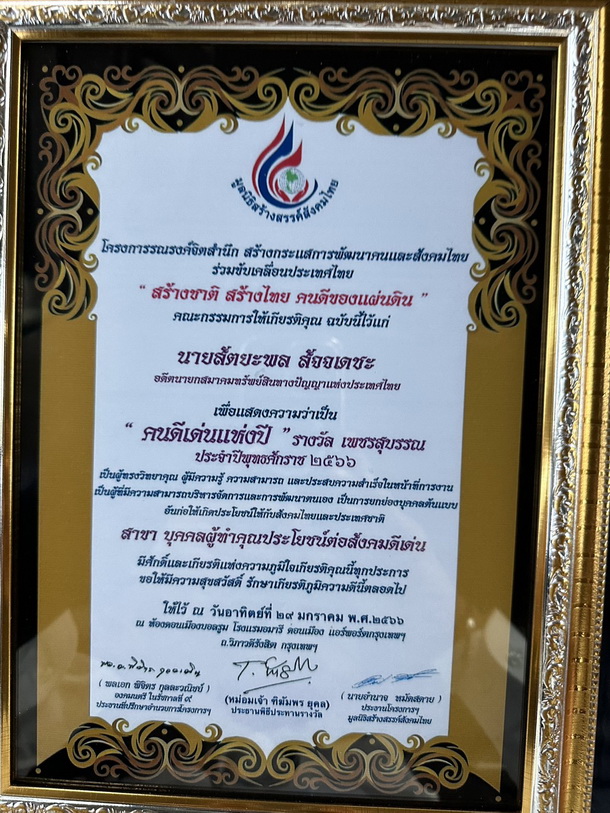 เมื่อวันที่ 29 มกราคม 2566 ณ ห้องดอนเมืองบอลรูม โรงแรมอมารี ดอนเมืองแอร์พอร์ต กรุงเทพฯ มีงานพิธีประกาศเชิดชูเกียรติ บุคคลต้นแบบของแผ่นดิน มอบรางวัล “เพชรสุบรรณ” คนดีเด่นแห่งปี 2566