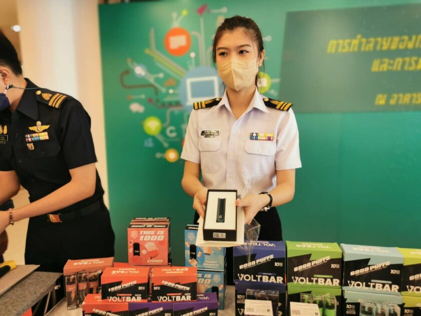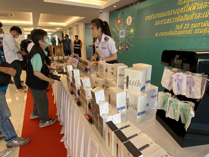 นายพันธ์ทอง ลอยกุลนันท์ รองอธิบดีกรมศุลกากร รักษาการในตำแหน่งที่ปรึกษาด้านการพัฒนาและบริหารการจัดเก็บภาษี ในฐานะโฆษกกรมศุลกากร เปิดเผยว่า กรมศุลกากรทำงานร่วมกับกองบังคับการปราบปรามการกระทำความผิดเกี่ยวกับอาชญากรรมทางเศรษฐกิจ และกองบัญชาการตำรวจสืบสวนสอบสวนอาชญากรรมทางเทคโนโลยี ได้จับกุมและตรวจยึดสินค้า ได้แก่ เครื่องบุหรี่ไฟฟ้า น้ำยาบุหรี่ไฟฟ้า หัวบุหรี่ไฟฟ้าที่ใช้สำหรับดูดและอุปกรณ์อื่น ที่มีการลักลอบนำเข้ามาในราชอาณาจักรไทยมาโดยตลอด และมีการดำเนินคดีจนถึงที่สุด ซึ่งของกลางดังกล่าวตกเป็นของแผ่นดิน สำหรับการทำลายของกลาง ในครั้งนี้ ประกอบด้วย เครื่องบุหรี่ไฟฟ้า น้ำยาบุหรี่ไฟฟ้า หัวบุหรี่ไฟฟ้าที่ใช้สำหรับดูดและอุปกรณ์อื่น ๆ รวมทั้งสิ้นเป็นจำนวน 874,535 ชิ้น คิดเป็นมูลค่าราคารวมค่ภาษีอากรทั้งหมด 72,019,523.46 บาท ทั้งนี้ บุหรี่ไฟฟ้า ซึ่งเป็นสิ่งของต้องห้ามนำเข้ามาในราชอาณาจักร เจ้าของหรือผู้ครอบครองมีความผิดตามกฎหมายศุลกากรในการช่วยซ่อนเร้น ช่วยจำหน่าย ช่วยพาเอาไปเสีย ซื้อ จำนำ หรือรับไว้โดยประการใด ซึ่งสิ่งของอันตนรู้ว่าเป็นของที่ยังมิได้ผ่านพิธีการศุลกากร หรือเคลื่อนย้ายของออกไปจากยานพาหนะ คลังสินค้าทัณฑ์บน โรงพักสินค้า ที่มั่นคง ท่าเรือรับอนุญาต หรือเขตปลอดอากร โดยไม่ได้รับอนุญาตจากพนักงานศุลกากร”