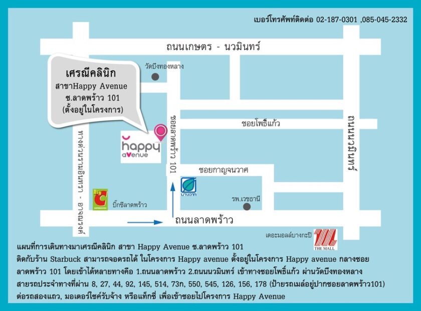 สาขา Happy Avenue ซ.ลาดพร้าว 101 (จอดรถในโครงการแฮปปี้คอนโด) โทร. 02-1870301 , 085-0452332