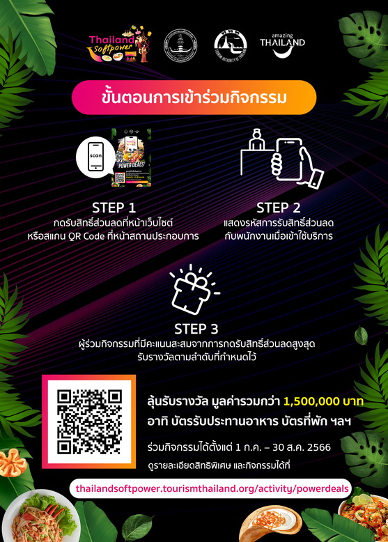ล่าสุด น.ส.ฐาปนีย์ เกียรติไพบูลย์ รองผู้ว่า ททท. ด้านภายในประเทศ จึงได้เปิดเผยถึงการจัดกิจกรรมส่งเสริมการตลาด 5F นำเสนอโปรโมชั่นและมอบส่วนลดพิเศษสำหรับใช้บริการโรงแรม ที่พัก ร้านอาหาร และแหล่งท่องเที่ยวต่าง ๆ ร่วมกับผู้ประกอบการทั่วไทย ในชื่อแคมเปญ “Power Deals” ที่รวบรวมสิทธิพิเศษและโปรโมชั่นสุดว้าว! ที่จะทำให้การเดินทางของคุณพิเศษมากกว่าเคย จากสถานประกอบการทั่วประเทศกว่า 450 ราย ทั้งโปรโมชั่นที่สามารถรับไปเลยแบบฟรีๆ หรือส่วนลดการซื้อสินค้าและบริการสูงสุดถึง 60% เพียงกดรับสิทธิพิเศษบนเว็บไซต์ หรือสแกน QR Code ที่หน้าสถานประกอบการที่เข้าร่วมโครงการทั่วประเทศ ไม่ว่าจะเป็น ร้านอาหารไทย , ร้านผ้าไทย , โรงแรม ที่พัก และสถานที่ท่องเที่ยวต่าง ๆ อีกมากมาย และยังสามารถสะสมคะแนนจากการกดรับสิทธิ์ส่วนลดและโปรโมชั่น เพื่อรับของรางวัล มูลค่ารวมกว่า 1.5 ล้านบาท อาทิ บัตรรับประทานอาหาร , บัตรที่พัก , สปา เป็นต้น โดยสามารถสะสมคะแนนเพื่อรับรางวัลได้ตั้งแต่วันนี้ – 30 สิงหาคม 2566 ยิ่งรับสิทธิ์ส่วนลดมากยิ่งมีสิทธิ์รับรางวัลมาก