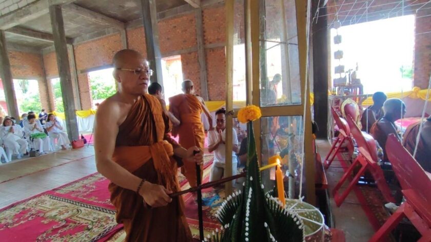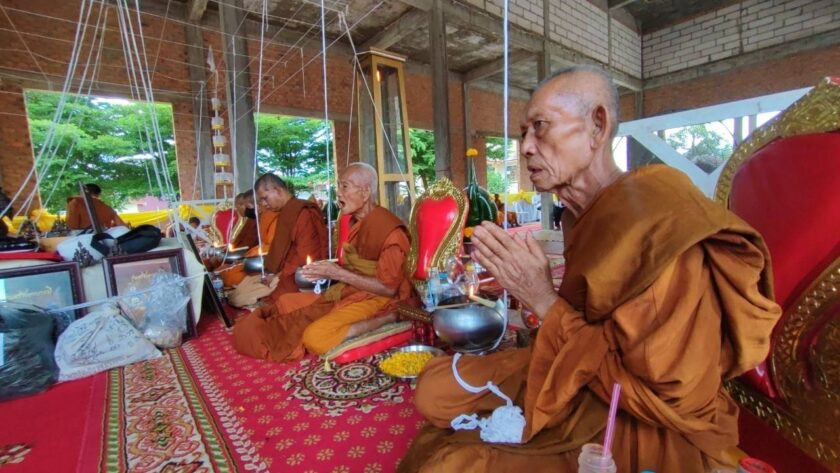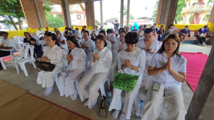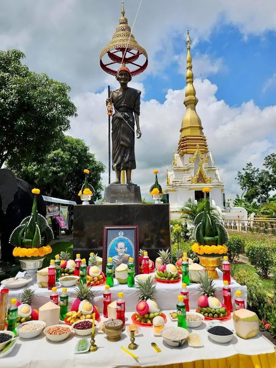 ช่วงเช้ามีพิธีบวงสรวงหน้าเจดีย์บรรจุสรีรสังขารหลวงปู่ ท่านผู้นำชุมชน กำนันสุจิตตรา อาษากิจ ท่านอิสรา โพธิ์เงิน นายอำเภอน้ำเกลี้ยงได้กล่าวต้อนรับคณะศิษยานุศิษย์, คุณแม่แก้ว สุดารัตน์ (แม่ณเดชน์ คูกิมิยะ)และคณะผู้มาร่วมงานในพิธีอย่างเป็นทางการ