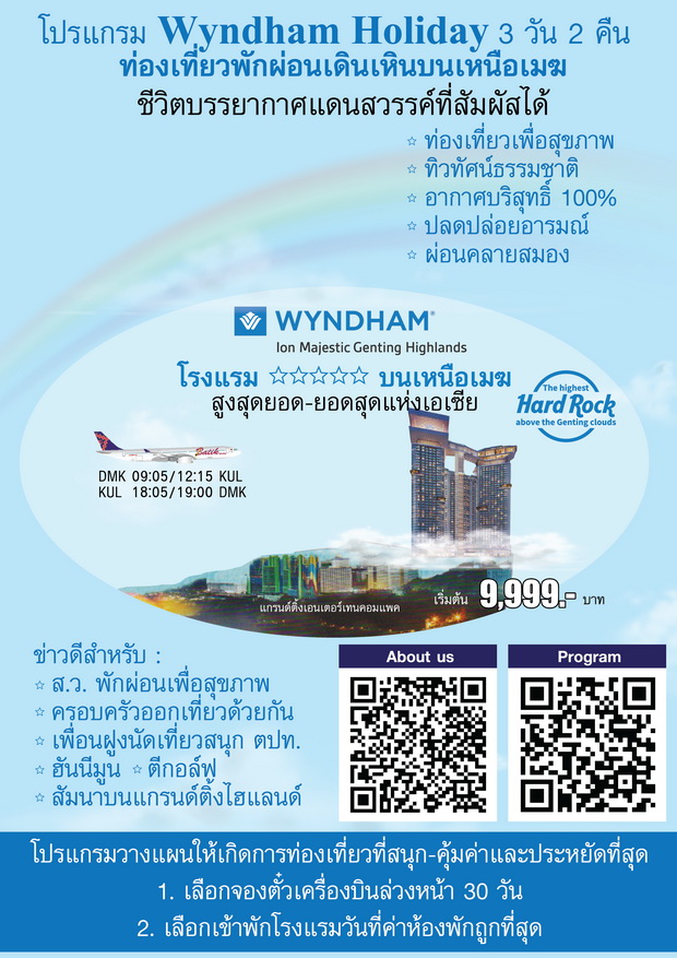 โปรแกรม Wyndham Holiday 3 วัน 2 คืน ท่องเที่ยวพักผ่อนเดินเหินบนเหนือเมฆ