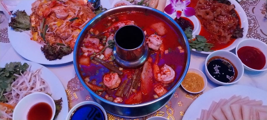 เย็นตาโฟหม้อไฟทรงเครื่อง มีทั้งลูกชิ้นปลา ปลาเส้นทอด (ฮือก้วย) ปลาหมึกกรอบ ตับหมู ผักบุ้ง และกุ้งตัวใหญ่เต็มปากเต็มคำ รสชาติถูกปากนักชิม