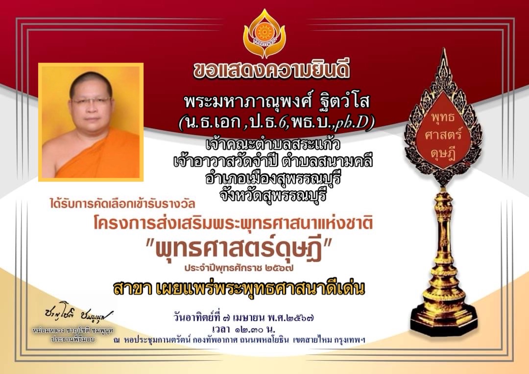 ภายในงาน มีพระมหาภาณุพงศ์ ฐิตวํโส เจ้าคณะตำบลสระแก้ว เจ้าอาวาสวัดจำปี ตำบลสนามคลี อำเภอเมืองสุพรรณบุรี จ.สุพรรณบุรี ได้รับคัดเลือกเข้ารับรางวัลพระกินรี คนดีของแผ่นดิน 2567 สาขาส่งเสริมศาสนาดีเด่น, รางวัลแห่งชาติ (Thai Award) สาขานักพัฒนาและทำคุณประโยชน์ต่อศาสนาและสังคมดีเด่น และ รางวัลโครงการส่งเสริมพระพุทธศาสนาแห่งชาติ “พุทธศาสตร์ดุษฎี” สาขาเผยแพร่พระพุทธศาสนาดีเด่น