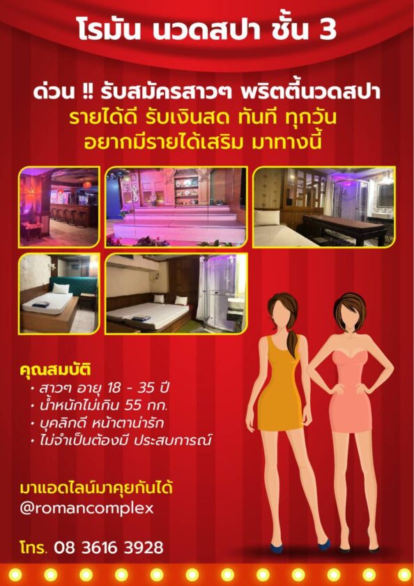 ROMAN Cafe’ & Massage (3 fl.) เปลี่ยนค่ำคืนที่เงียบเหงาให้สนุกสนานด้วยกิจกรรมบันเทิงหลากหลาย อาทิ เช่น ร้องเพลง , เต้นโชว์ , มายากล , นวดแผนไทย พร้อมเครื่องดื่ม และอาหารเลิศรสราคาคุ้มค่า ที่จะนำความสุขมาสู่คุณและคนพิเศษ