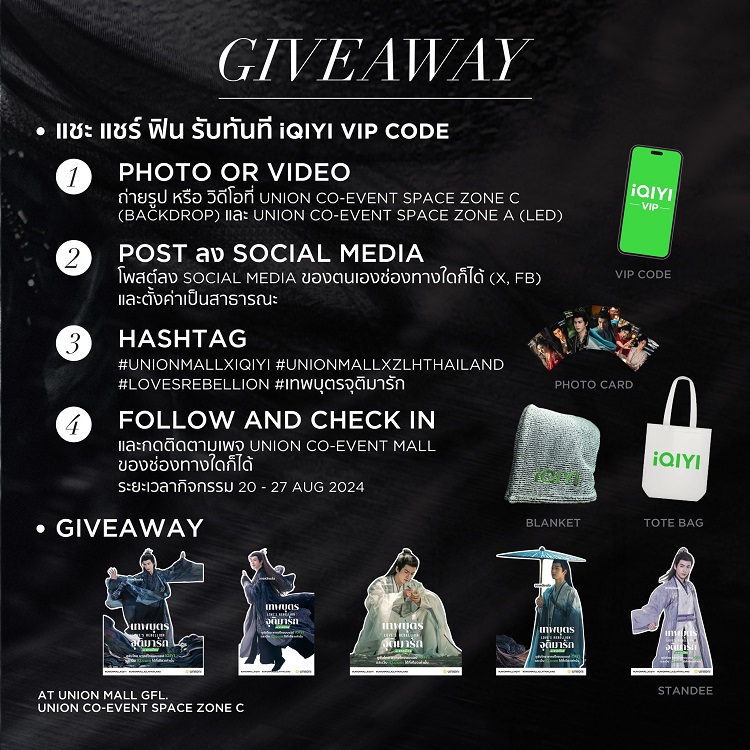 iQIYI (อ้ายฉีอี้) ยังมอบประสบการณ์สุดพิเศษเหนือใครกับการรับชมตอนจบซีรีส์ “เทพบุตรจุติมารัก (Love’s Rebellion)” พร้อมกันที่ UNION CO-EVENT SPACE ZONE C ที่เรียกว่ากระแสปัง สิทธิ์การเข้าร่วมเต็มตั้งแต่ 10 นาทีแรก สำหรับใครที่พลาดไปสามารถไปร่วมรับ SPECIAL GIVEAWAY สุดพิเศษอีกมากมาย จาก iQIYI THAILAND และ บ้านจางหลิงเฮ่อไทยแลนด์ (ZHANGLINGHE THAILAND) อาทิ PHOTO CARD / OFFICIAL STANDEE / BLANKET / TOTE BAG มาร่วมแสดงพลังและสร้างความทรงจำดี ๆ ไปด้วยกัน