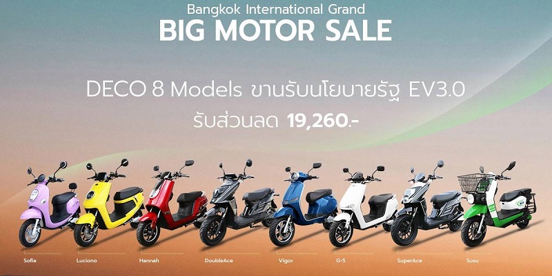 นายกฤตเมธ ตั้งพิชญโพธิวัฒน์ ประธานเจ้าหน้าที่บริหารบริษัท เดโก้ กรีน เอนเนอร์จี จํากัด กล่าวว่า ทาง DECO ได้ นํารถมอเตอร์ไซค์ไฟฟ้าทั้งหมด 8 รุ่น เข้าร่วมงาน Big Motor Sale 2024 ณ ไบเทค บางนา ในวันที่ 23 สิงหาคม – 1 กันยายน 2567 ซึ่งรถทุกรุ่นนี้ได้รับการสนับสนุนจากรัฐบาลเพื่อส่งเสริมการใช้ยามยนต์ไฟฟ้าในประเทศไทย ซึ่งยังคง ได้รับการสนับสนุนต่อเนื่องจนถึงสิ้นปี 2568