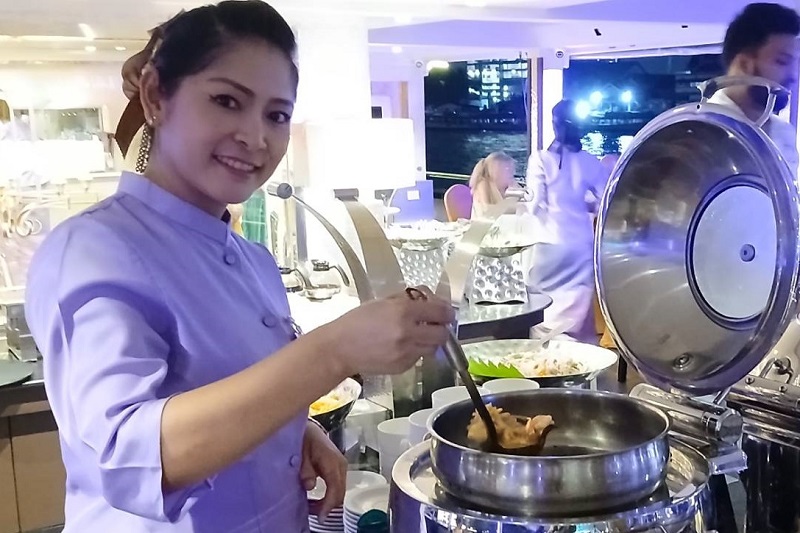 มาที่เรื่องอาหารการกิน ก็มีให้ครบทุกรสชาติ ไม่ว่าจะเป็นอาหารทะเล กุ้ง หอย ปู ปลา มาที่นี่มีครบจบบนเรือ Chaophraya Cruise อิ่มอร่อยไปกับอาหารทะเลบุฟเฟต์นานาชาติ ส่วนท่านที่ชอบอาหารไทย ก็มีให้ลิ้มรสซดน้ำซุปไก่ชุบแป้งทอด พร้อมทั้งชากาแฟที่คุณแม่ชอบ ร่วมรื่นรมย์เพลิดเพลินไปกับเสียงโซปราโน แซกโซโฟน จาก อาจารย์สามารถ คำโคกกรวด จากวง Celebration ฟังเสียงเพลงจากนักร้องสาวสวยที่ได้คัดสรรแนวเพลงให้เข้ากับบรรยากาศ โดยได้สัมผัสความชื่นชมผสมความสวยงามและความโรแมนติคของสองฝั่งแม่น้ำเจ้าพระยา มาเหม่อมองสายน้ำแห่งชีวิตและบรรยากาศกรุงเทพฯ ยามราตรี ยากที่จะหาชมได้
