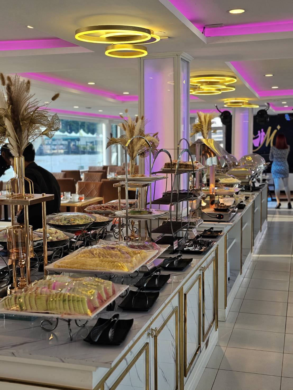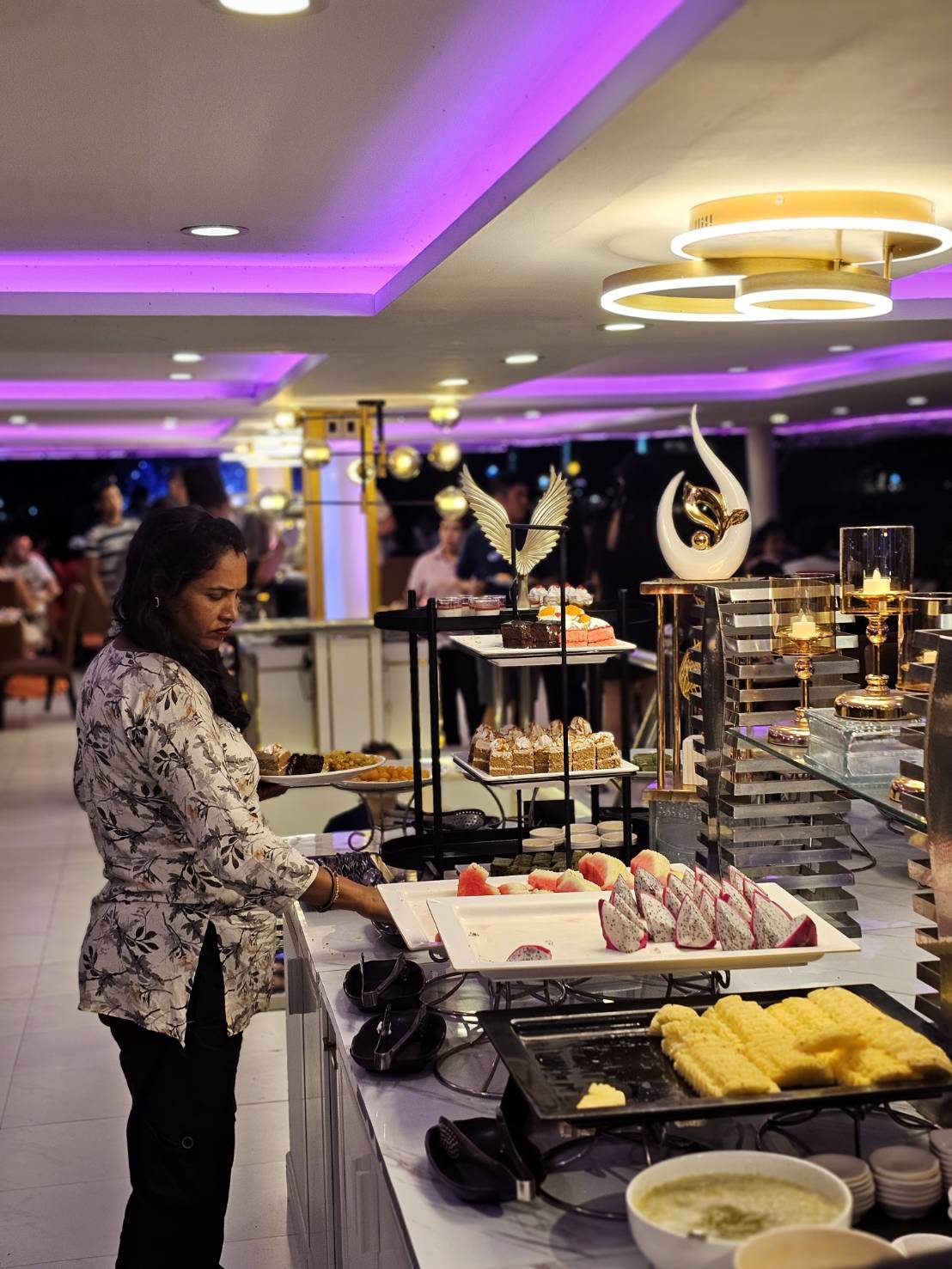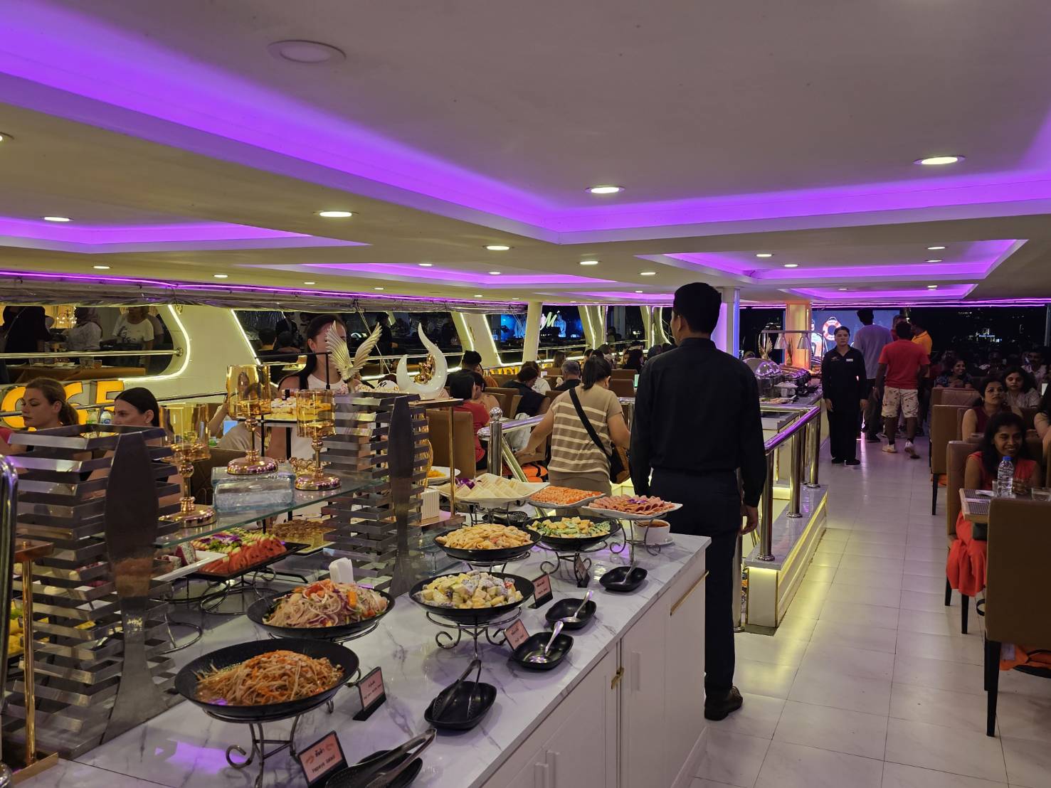 ท่านสามารถเลือกใช้บริการได้ถึง 2 รอบเวลา ได้แก่ รอบพระอาทิตย์ตกดิน (Twilight) หรือรอบดินเนอร์ (Dinner) จัดเต็มกับเมนูมากมายไม่ว่าจะเป็นเมนูซีฟู้ด อาทิ กุ้งแม่น้าย่าง หอยอบเนย แซลมอนซาชิมิ ซูชิหน้าต่างๆ ขนมหวานหลากหลายชนิด เช่น พานาคอตต้า เครมบรูเล่ ฯลฯ นอกจากนี้ทุกท่านจะได้รับฟังดนตรีสดแสนเพลิดเพลินจาก Live Band และการแสดงนาฏศิลป์ไทยไม่ซ้าใคร เพียงเท่านี้ทุกท่านจะได้อิ่มกายอิ่มใจและประทับใจกับการบริการของเรือสาราญเมอริเดียน ครูซ ไม่รู้ลืม…