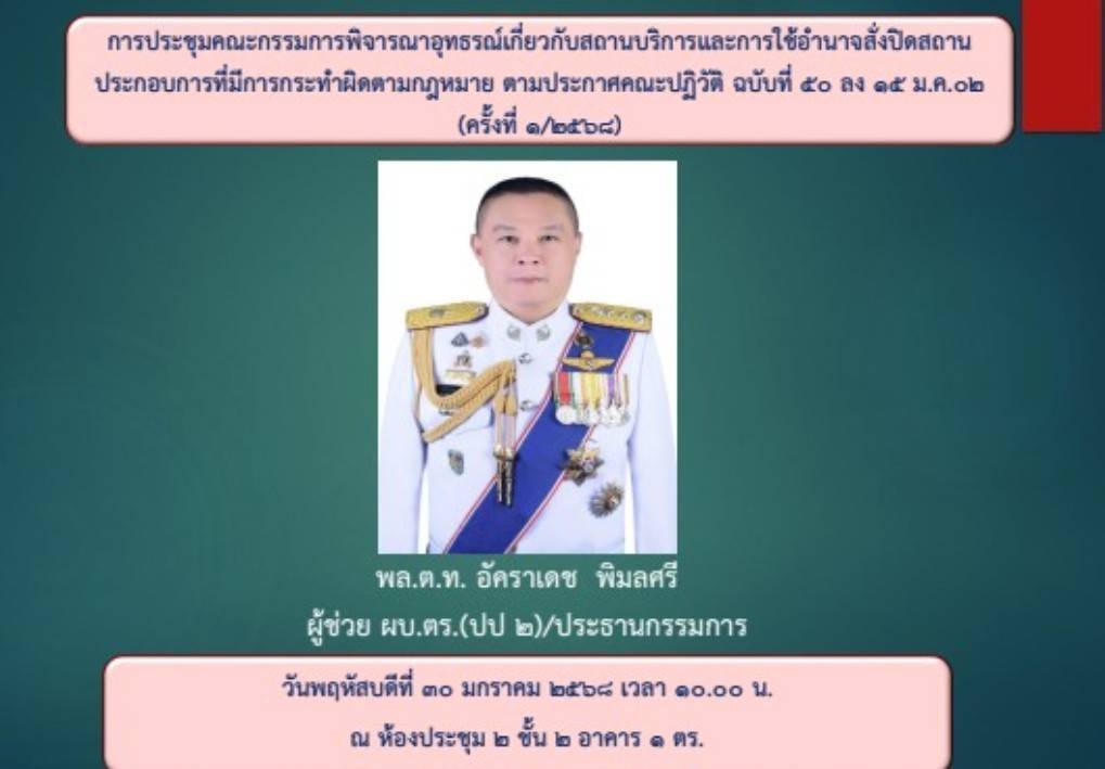 วันที่ 30 ม.ค.68 ที่ห้องประชุม 2 ชั้น 2 อาคาร 1 สำนักงานตำรวจแห่งชาติ พล.ต.ท.อัคราเดช พิมลศรี ผู้ช่วย ผบ.ตร.(ปป 2)(สส 2)/ ประธานกรรมการ เป็นประธานประชุมคณะกรรมการพิจารณาอุทธรณ์เกี่ยวกับสถานบริการและการใช้อำนาจสั่งปิดสถานประกอบการที่กระทำผิดกฎหมาย ตามประกาศคณะปฏิวัติ ฉบับที่ 50 ลงวันที่ 15 มี.ค. 2502 ครั้งที่ 1/2568