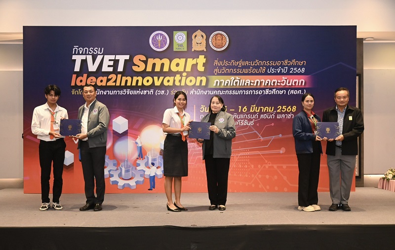 เมื่อวันอาทิตย์ที่ 16 มีนาคม 2568 สำนักงานการวิจัยแห่งชาติ(วช.) กระทรวงการอุดมศึกษา วิทยาศาสตร์ วิจัยและนวัตกรรม ร่วมกับ สำนักงานคณะกรรมการการอาชีวศึกษา(สอศ.) จัดกิจกรรม “TVET Smart Idea2Innovation : สิ่งประดิษฐ์และนวัตกรรมอาชีวศึกษาสู่นวัตกรรมพร้อมใช้” ภาคใต้และภาคตะวันตก โดย ดร.วิภารัตน์ ดีอ่อง ผู้อำนวยการสำนักงานการวิจัยแห่งชาติ เป็นประธานในพิธีมอบรางวัลกิจกรรมติดดาว และมอบเกียรติบัตรให้แก่ผู้ผ่านการฝึกอบรม ณ โรงแรมหัวหินแกรนด์ แอนด์ พลาซ่า จังหวัดประจวบคีรีขันธ์