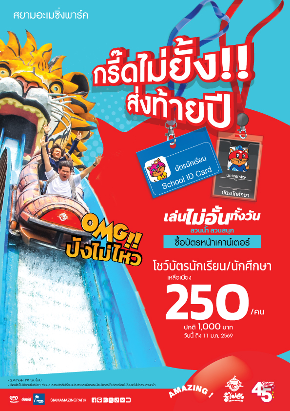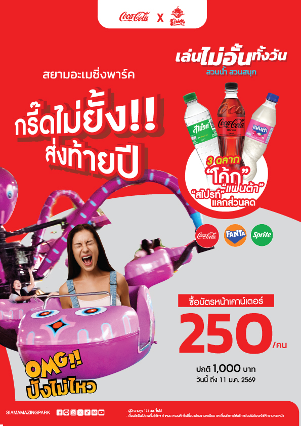 เซอร์ไพรส์ใหญ่ส่งท้ายปี สยามอะเมซิ่งพาร์คจัดให้ นำฉลาก “โค้ก” “แฟนต้า” หรือ “สไปรท์” รสชาติใดก็ได้ 3 ฉลาก หรือ แสดงบัตรนักเรียน/นักศึกษา รับส่วนลดทันทีหน้าเคาน์เตอร์ ซื้อบัตรผู้ใหญ่ (131 ซม. ขึ้นไป) เที่ยวสวนน้ำสวนสนุกไม่อั้นทั้งวัน เหลือเพียงคนละ 250.- (ปกติ 1,000.-) โปรแรงขนาดนี้ พลาดไม่ได้แล้ว