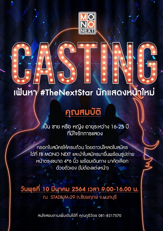 โอกาสเข้าสู่วงการบันเทิงมาถึงแล้ว เมื่อ คุณธัญญา วชิรบรรจง ประธานเจ้าหน้าที่ฝ่ายผลิตรายการ บริษัท โมโน เน็กซ์ จำกัด (มหาชน) ประกาศเปิดรับสมัครคัดเลือกนักแสดงหน้าใหม่ พร้อมทำการคัดเลือกด้วยตัวเอง เพียงมีคุณสมบัติเป็น ชาย หรือ หญิง อายุระหว่าง 16-25 ปี ที่มีใจรักการแสดง กรอกใบสมัครให้ครบถ้วน โดยดาวน์โหลดใบสมัครได้ที่ https://www.mono.co.th/mononextcasting/ และนำใบสมัครมายื่นแนบรูปถ่ายหน้าตรงขนาด 4*6 นิ้ว พร้อมเดินทางมาคัดเลือกด้วยตัวเอง (ไม่ต้องแต่งหน้า) ในวันพุธที่ 10 มีนาคม 2564 ตั้งแต่เวลา 9.00-16.00 น. ณ STADIUM 29 ถ.ชัยพฤกษ์ จ.นนทบุรี สนใจสอบถามเพิ่มเติมได้ที่ คุณภูริวัตร 081-8317570