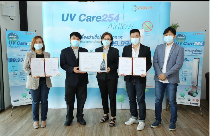สำหรับ เครื่องฆ่าเชื้อโรคในอากาศของไทยแบรนด์ “Sol-n(โซล-เอ็น) UV Care254 Airflow เกิดจากพัฒนาคิดค้นนวัตกรรมใหม่ โดยทีมนักวิทยาศาสตร์เป็นผู้เชี่ยวชาญด้านจุลชีววิทยาของชาวไทยที่ได้รับการยอมรับในระดับประเทศ คิดค้น และผลิตเครื่องฆ่าเชื้อโรคในอากาศและไวรัสเป็นรายแรกของไทย ที่สามารถฆ่าเชื้อโรคในอากาศ เชื้อไวรัสต่าง ๆ รวมไปถึงเชื้อไวรัสโคโรนา หรือโควิด -19 โดยผ่านการทดสอบประสิทธิภาพการฆ่าเชื้อโรคจากไบโอเทค หรือศูนย์พันธุวิศวกรรมและเทคโนโลยีชีวภาพแห่งชาติ และ ศูนย์ทดสอบผลิตภัณฑ์ไฟฟ้าและอิเล็กทรอนิกส์ (PTEC) ว่ามีอัตราการฆ่าเชื้อโรคได้มากกว่า 99.99% สามารถฆ่าเชื้อโรคได้สูงกว่าระดับมาตรฐานถึง 40 เท่า และผ่านการรับรองจาก สำนักงานคณะกรรมการคุ้มครองผู้บริโภค (สคบ.) ถึงการใช้งานสัมผัสกับคนได้อย่างปลอดภัย