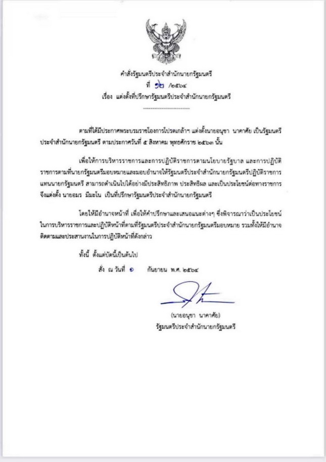 สั่ง ณ วันที่ 1 กันยายน พ.ศ. 2564