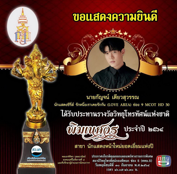 รางวัลพิฆเนศวร สาขา นักแสดงชายหน้าใหม่ยอดเยี่ยม ได้แก่ กัญจน์ เตียวสุวรรณ และชวิศพงศ์ พูสมจิตสกุล นักแสดงจากซีรี่ย์ “ครั้งหนึ่งเราเคยรักกัน” (Love Area) ช่อง 9 MCOT HD30