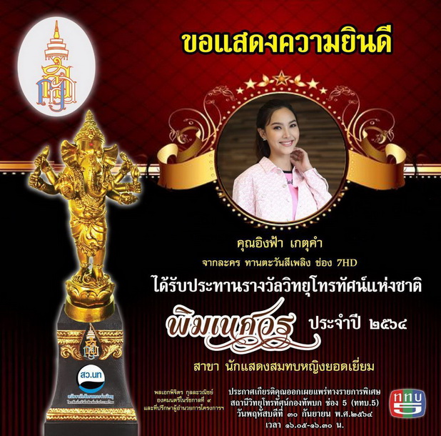 รางวัลพิฆเนศวร สาขา นักแสดงสมทบหญิงยอดเยี่ยม ได้แก่ อิงฟ้า เกตุคำ นักแสดงจากละครเรื่อง “ทานตะวันสีเพลิง” ผลิตโดย บริษัท ปภัสราโปรดักชั่น จำกัด ออกอากาศทางสถานีโทรทัศน์สีกองทัพบกช่อง 7