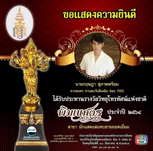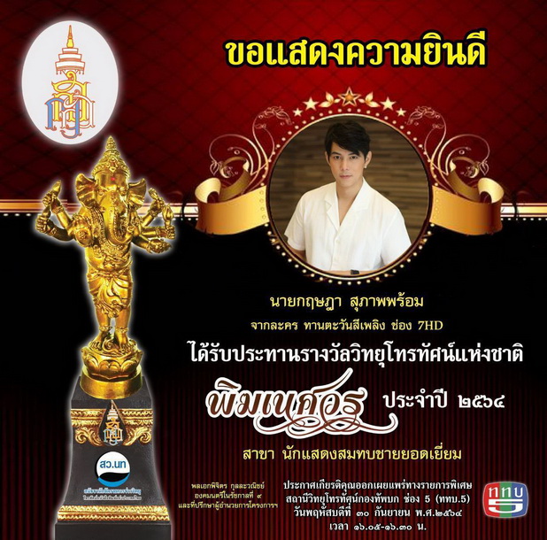 “รู้สึกเป็นเกียรติมากๆ ครับ ต้องกราบขอบพระคุณคณะกรรมการทุกท่านที่เล็งเห็นความสามารถของบิ๊ก อย่างที่รู้กัน บิ๊ก เล่นร้ายมาหลายเรื่อง แต่ละคร ทานตะวันสีเพลิง เป็นตัวร้ายที่ร้ายกาจมาก ร้ายสุดๆ จนแฟนๆ ละครอินหนักมาก บิ๊กออกไปซื้อของ แม่ค้าบางรายจะไม่ขายของให้บิ๊กด้วยครับ เขาบอกร้ายมาก แต่ก็ดีใจที่ผลงานของเราได้การตอบรับที่ดีครับ ที่สำคัญบิ๊กขอกราบขอบพระคุณผู้ใหญ่ทางช่อง 7HD และแม่กบ ปภัสรา ที่ให้โอกาสบิ๊ก รับบท ทัพไท จนได้รับรางวัลพิฆเนศวร ในครั้งนี้ครับ”