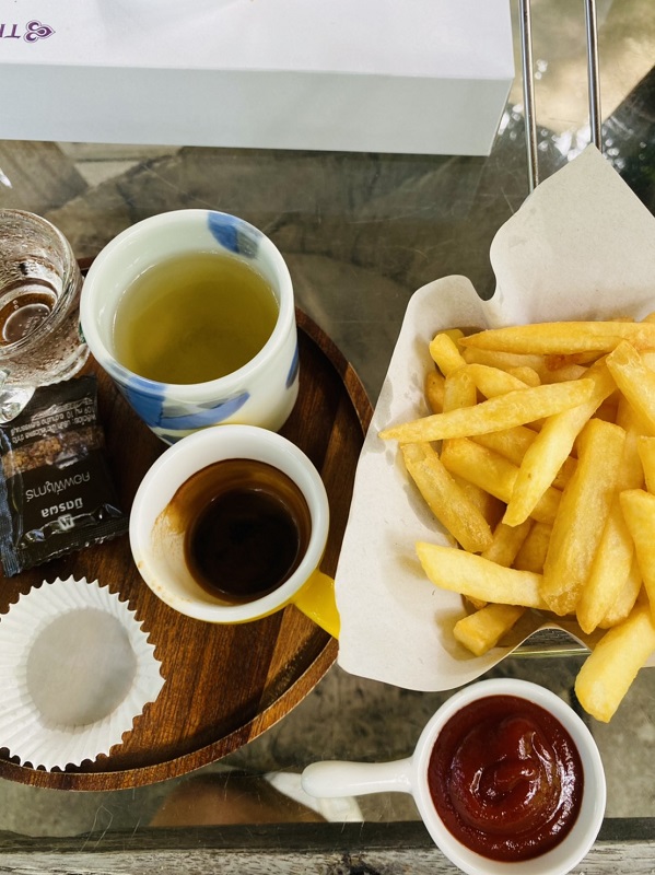 ส่วนผมก็เช่นเคย ขอเป็นเอสเพรสโซ่ร้อน 1 ถ้วย ทางร้านจัดเป็นชุดมาเสิร์ฟเป็นถาดเล็ก ๆ ดูน่ารักมีเอสเพรสโซ่ร้อน มีขนมปังและน้ำชาร้อนแถมมาด้วย สั่งคู่กับมันฝรั่งทอดหรือเฟรนส์ฟรายส์ราคาจานละ 50 บาท เบ็ดเสร็จจ่ายเงินไป 85 บาท จัดว่าราคาไม่แพงเลยครับ ส่วนผู้ที่ชอบกาแฟเข้มข้นแบบเย็นๆ สั่งได้มอคค่าเย็นหรือจะปั่นก็มี นอกจากนี้ก็ยังมีเมนูอื่นๆ ให้เลือกอีกหลายหลายตามชอบของแต่ละท่านครับ ทุกท่านสามารถเลือกที่นั่งได้ในมุมมองของผู้มาเยือนตามชอบตามสไลต์ของแต่ละท่านครับ ชอบชิล ๆ สบาย ๆ ในสวนเหมือนบ้านตนเองที่มีโอโซนเยี่ยม มีชิงช้าให้นั่งเล่น หรือจะเลือกห้องแอร์เย็น หรือจะเลือกรับลมใต้ร่มไม้ร่มรื่นก็ได้เช่นกัน