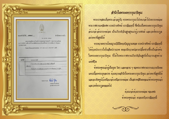 โดยก่อนหน้านี้ บิณฑ์ บันลือฤทธิ์ และเอกพัน บรรลือฤทธิ์ ได้โพสต์ผ่านเฟซบุ๊คส่วนตัวถึงหมายรับสั่งที่ ๑๒๒๖๙ จากสำนักพระราชวัง ลงวันที่ ๒๖ ตุลาคม ๒๕๖๔ บันทึกความว่า