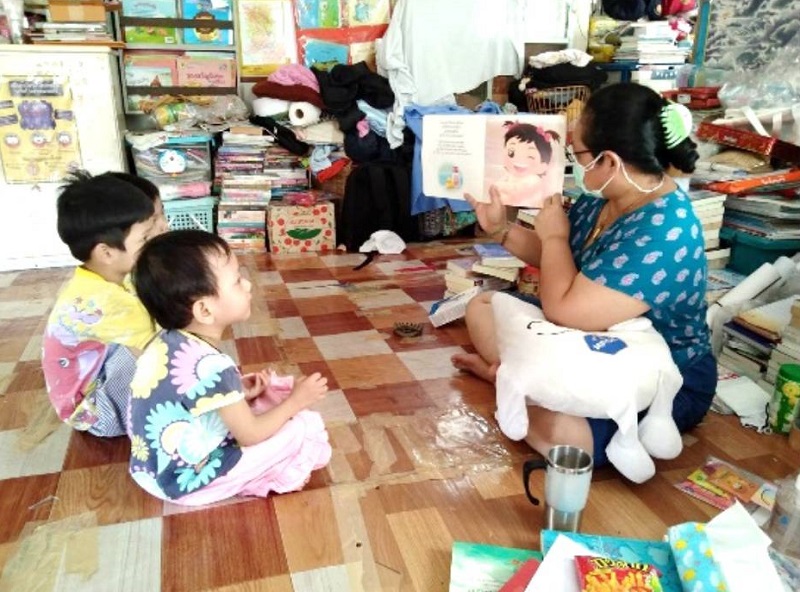 ครูส้มสอนเด็กตั้งแต่แรกเกิด – 4 ปีก่อนเข้าอนุบาลค่ะ เป็นเด็กก่อนปฐมวัย แต่อย่าเรียกว่าสอนเลยค่ะ ให้เรียกว่าดูแลเด็กเพื่อให้มีพัฒนาตามวัยดีกว่าค่ะ โดยหนังสือที่ได้มาจากการสนับสนุนของมูลนิธิเด็กอ่อนในสลัมฯ ช่วงแรก ๆ แต่ต่อมาได้รับหนังสือบริจาคจากเพื่อน ๆ ใน Facebook และโครงการรักการอ่านของสสส. ที่เป็นหนังสือนิทานสำหรับเด็กค่ะ ครูส้มเลี้ยงเด็กมา 16 ปีแล้วค่ะ และได้รับใบประกาศนียบัตรคุณวุฒิวิชาชีพบริการสุขภาพ อาชีพผู้ดูแลเด็ก มาตรฐานอาชีพ พ.ศ.2560 ได้รับการอบรมจากมูลนิธิเด็กอ่อนในสลัมฯ ตามหลักสูตรผู้ดูแลเด็กค่ะ ซึ่งครูส้มไม่ได้เป็นครูของรัฐบาลแต่เคยเป็นครูสอนเด็กในโรงเรียนเอกชนแห่งหนึ่งและได้รับใบประกาศจากรมกิจการเด็กและเยาวชนค่ะ