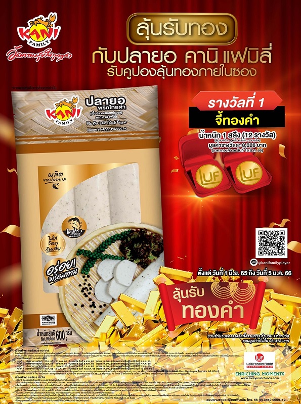 พร้อมจัดโปรโมชั่นพิเศษ ลุ้นรับทอง กับ ปลายอ คานิ แฟมิลี่ เฉพาะขนาด 600 กรัม รับคูปองลุ้นทองภายในซอง ด้วยรางวัล “จี้ทองคำ” น้ำหนัก 1 สลึง (รวมจำนวน 12 รางวัล) ตั้งแต่วันที่ 1 มิ.ย. 65 ถึงวันที่ 5 ม.ค. 66