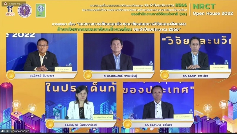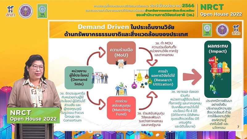 วันที่ 13 มิถุนายน 2565 สำนักงานการวิจัยแห่งชาติ (วช.) กระทรวงการอุดมศึกษา วิทยาศาสตร์ วิจัยและนวัตกรรม จัดการประชุมชี้แจงกรอบการวิจัยและนวัตกรรมด้านทรัพยากรธรรมชาติและสิ่งแวดล้อม ประจำปีงบประมาณ 2566 และการแถลงผลสำเร็จจากผลงานวิจัยและนวัตกรรมด้านทรัพยากรธรรมชาติและสิ่งแวดล้อม NRCT Open House 2022 “วิจัยและนวัตกรรมในประเด็นท้าทายของประเทศ” เพื่อชี้แจงกรอบการวิจัยและนวัตกรรม ประจำปีงบประมาณ 2566 ของ วช. และแนวทางการเขียนและพิจารณาข้อเสนอการวิจัยและนวัตกรรม รวมทั้งแถลงผลสำเร็จจากการวิจัยและนวัตกรรม เพื่อเป็นเวทีแลกเปลี่ยนประสบการณ์การเขียนข้อเสนอการวิจัยและนวัตกรรม และการยื่นขอทุน วช. ด้านทรัพยากรธรรมชาติและสิ่งแวดล้อม โดย ดร.วิภารัตน์ ดีอ่อง ผู้อำนวยการสำนักงานการวิจัยแห่งชาติ เป็นประธานเปิดการประชุมฯ
