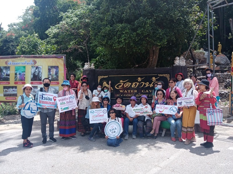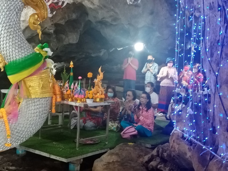 ต่อจากนั้นเราก็นมัสการพระพุทธไสยาสน์ พระราหู และเจ้าแม่กวนอิมปางไสยาสน์ แล้วเดินมาสู่ลานพระพุทธเจ้าโปรดเศรษฐีทั้ง 7 ซึ่งพระพุทธรูปองค์นี้ปางสมาธิรูปแบบการก่อสร้างอินเดีย เมื่อเสร็จภารกิจกราบไหว้แล้ว สมาชิกทั้งหมดออกเดินทางเพื่อจะไปกราบไหว้หลวงพ่อเงินที่นอนอยู่ในโลงแก้ว หลังจากท่านมรณภาพแล้วร่างกายกลับไม่เน่าเปื่อย อยู่ในศาลามณฑป ในวัดถ้ำน้ำ แห่งเดียวในราชบุรีที่ทางวัดจัดรูปแบบทางเดินมีทั้งสะพานเดินไปดูความสวยงามของหินย้อยหินงอก ภายในถ้ำน้ำถ้ำนาคา มีน้ำขังเป็นบึงกว้างพอประมาณ ทางคุณอ้วน ปาณิษา นำสมาชิกนั่งสวดมนต์บูชาพระยานาคราชที่อยู่ในถ้ำนาคา เสร็จแล้วยังมีทางเดินขึ้นไปกราบไหว้บูชาพระพุทธรูปอยู่ข้างบน แต่สมาชิกสูงวัยเลยเดินไปส่วนหนึ่งแล้วก็กลับออกมากราบไหว้สรีระหลวงพ่อเงินภายในห้องมณฑป ก่อนที่จะออกเดินทางไปทางอาหารกลางวันที่ร้านเพลินดี ซึ่งทาง ททท.สำนักงานราชบุรีเชิญชวนให้มาทานอาหารที่ร้านแห่งนี้ โดนมีรองเล็ก รองผอ.ททท.สำนักงานราชบุรี เป็นผู้ต้อนรับ พวกเราทานอาหารกันอย่างอร่อยในมื้อกลางวัน สมราคาที่พูดเอาไว้ว่าอร่อยดี
