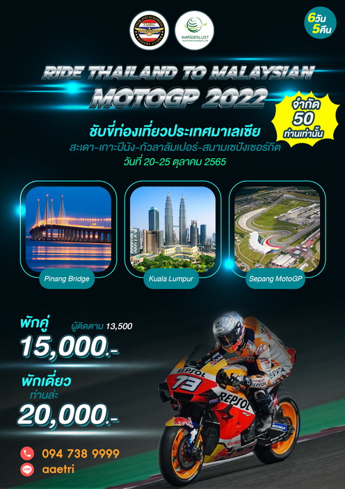 ผู้ขับขี่ พักคู่ 2 ท่าน ต่อ 1 ห้อง รวมค่าบัตรแกรดสแตนโมโตจีพี + เอกสารรถข้ามแดน ท่านล่ะ 15,000 บาท