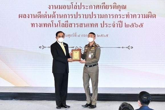 พล.อ.ประยุทธ์ นายกรัฐมนตรี มอบโล่ “บิ๊กแจง” ผบช.ตำรวจไซเบอร์ พร้อมตำรวจในสังกัด 20 นาย ประกาศเกียรติคุณผลงานดีเด่น ด้านการปราบปราม การกระทำความผิดทางเทคโนโลยีสารสนเทศ ประจำปี 2565