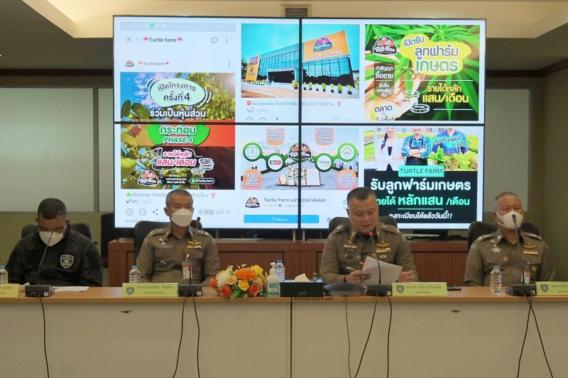 เมื่อวันที่ 5 ส.ค.65 เวลาประมาณ 10.00 น. กองบัญชาการตำรวจสืบสวนสอบสวนอาชญากรรมทางเทคโนโลยี (บช.สอท.) ภายใต้การนำของ พล.ต.ท.กรไชย คล้ายคลึง ผบช.สอท., พล.ต.ต.ภาณุมาศ บุญญลักษม์ รอง ผบช.สอท.. พล.ต.ต.ชูฉัตร ธารีฉัตร รอง ผบช.สอท.. พล.ต.ต.มนเทียร พันธ์อิ่ม รอง ผบช.สอท..พล.ต.ต.รณชัย จินดามุข ผบก.สอท. 1, พล.ต.ต.ออมสิน ตรารุ่งเรือง ผบก.สอท.3 และเจ้าหน้าที่ที่เกี่ยวข้องร่วมกันแถลงข่าวกรณีการทลายเครือข่ายหลอกลงทุน Turtle Farm เจ้าหน้าที่ตรวจค้น และจับกุมผู้ต้องหารายสำคัญ มีรายละเอียดดังนี้
