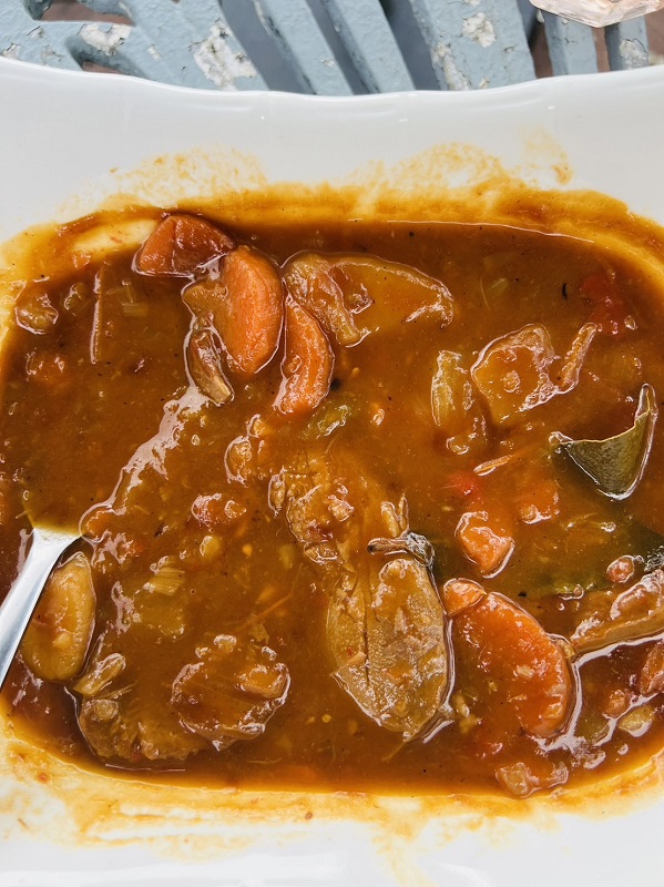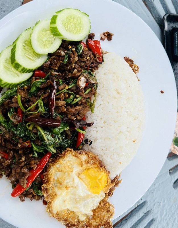 สำหรับอาหารเมนูเด็ดซิกเนเจอร์ของ สวนกาแฟแม่นิ่ม ก็ถูกใจเช่นกัน คือผัดกะเพราเนื้อสับพริกขี้หนูแห้ง ราดข้าวบวกไข่ดาวสุกกรอบๆ อู้ฮู! รสชาติได้ใจถูกต้องดีครับ เนื้อสับก็นุ่ม หอมน้ำมันงาที่ใช้ผัดเคล้ายอดกะเพรามาเต็มๆ เมนูนี้ก็จะเอาว่าเป็นซิกเนเจอร์ของที่ร้านอีกเมนูหนึ่งนอกเหนือจากสตูว์ลิ้นวัวที่ผมบอก คุณพรีมบอกว่าวัตถุดิบที่ร้านคัดสรรมาอย่างดี อย่างสตูว์ลิ้นวัวที่สั่งมากินกับข้าวสวยร้อนร้อน ลิ้นวัวนิ่มมมมม มากกกก จนแทบจะละลายในปากเลยทีเดียว ชามใหญ่ใหญ่กินกันได้ถึงสามสี่คน