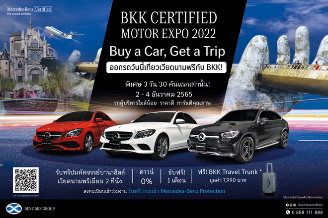 นอกจากนั้นBKK Café มีบริการเสริฟ์อาหาร และเครื่องดื่มฟรีตลอดงาน พร้อมกิจกรรมลุ้นรางวัลพิเศษส่งท้ายปีแบบจัดเต็ม! ไม่ว่าจะเป็น iPhone14, Apple Watch, ลำโพง Marshall, Gift Card, Scooterไฟฟ้า, บัตรชมภาพยนตร์ และของรางวัลอื่นๆมูลค่ารวมกว่า 4 ล้านบาท! อีกทั้งผู้ที่สนใจรถ Mercedes-Benz Certified ผู้บริหารไมล์น้อย รถมือสองราคาดี การันตีคุณภาพ ผ่านการตรวจเช็คกว่า 200 จุดตามมาตรฐานเมอร์เซเดส-เบนซ์ ก็มีโปรฯเด็ดในงาน BKK CERTIFIED MOTOR EXPO 2022 ระหว่างวันที่ 2-4 ธันวาคมนี้! จองและรับรถภายใน 15 ธันวาคม รับทริปบินลัดฟ้าไปเที่ยวเวียดนามแบบเอ็กซ์คลูซีฟ 2 ที่นั่ง ฟรี! พร้อมข้อเสนอ ดาวน์ 0% หรือขับฟรี 1เดือน พร้อม รับกระเป๋าเดินทาง BKK Travel Trunk 1ใบ มูลค่า 7,990 บาท รวมถึงลูกค้ายังสามารถนำรถคันเก่ามาแลกคันใหม่ภายในงาน รับบัตรเติมน้ำมันฟรี!อีก 50,000 บาท นอกจากนั้นเบนซ์ บีเคเค กรุ๊ป-บางนา ยังได้ร่วมกับทางเมอร์เซเดส-เบนซ์ ประเทศไทย จัดกิจกรรม Benz BKK Service Clinic 2022 ขึ้นเพื่อให้บริการตรวจเช็ครถ พร้อมตอบข้อสงสัยเกี่ยวกับการใช้รถ โดยช่างผู้เชี่ยวชาญจากประเทศเยอรมนี ร่วมกับช่างเทคนิคผู้เชี่ยวชาญของเบนซ์ บีเคเค กรุ๊ป-บางนา เพื่อเสริมสร้างความสัมพันธ์อันดี และความมั่นใจในการเลือกเมอร์เซเดส-เบนซ์ เป็นแบรนด์คู่ใจ ให้กับลูกค้าบริการหลังการขาย ระหว่างวันที่ 28 พฤศจิกายน – 2 ธันวาคม นี้!”