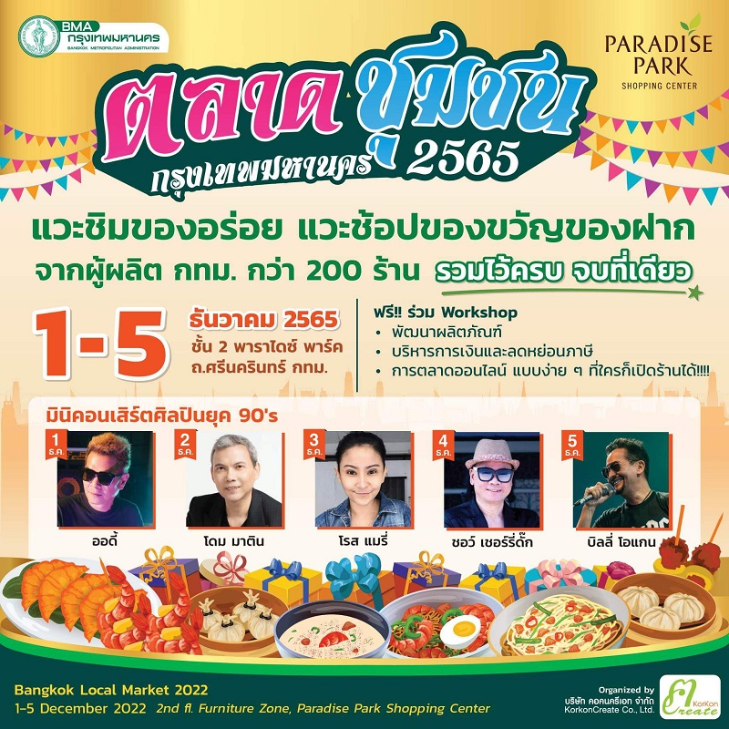 เหล่าศิลปินดังยุค 90 นำโดย บิลลี่ โอแกน, โรสแมรี่, โดม มาติน, ออดี้ และ ชอว์ เชอร์รี่ดั๊ก ชวนเที่ยวงาน “ตลาดชุมชนกรุงเทพมหานคร 2565” ในวันที่ 1- 5 ธันวาคมนี้ ที่ ชั้น 2 พาราไดซ์พาร์ค ถนนศรีนครินทร์